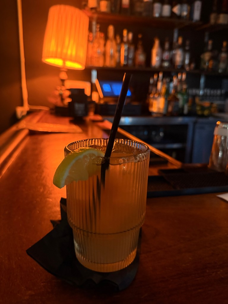 In the photos I took you can literally feel the warmth. The bar counter shines under that golden light. The shelves behind the bar are stacked with bottles that look like they belong in an old film. It feels cozy but elevated.