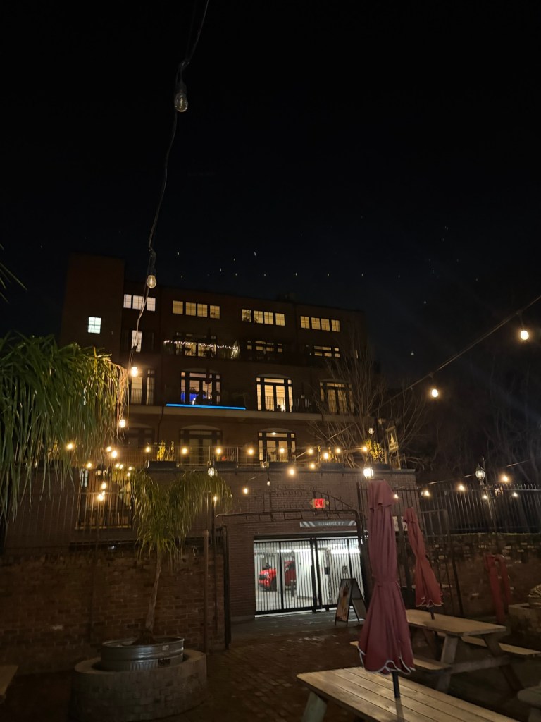 Outside, the string lights glow overhead. The brick walls. The historic buildings. The patio setup makes it feel like a hidden courtyard. When night fully hits, that space becomes magic.