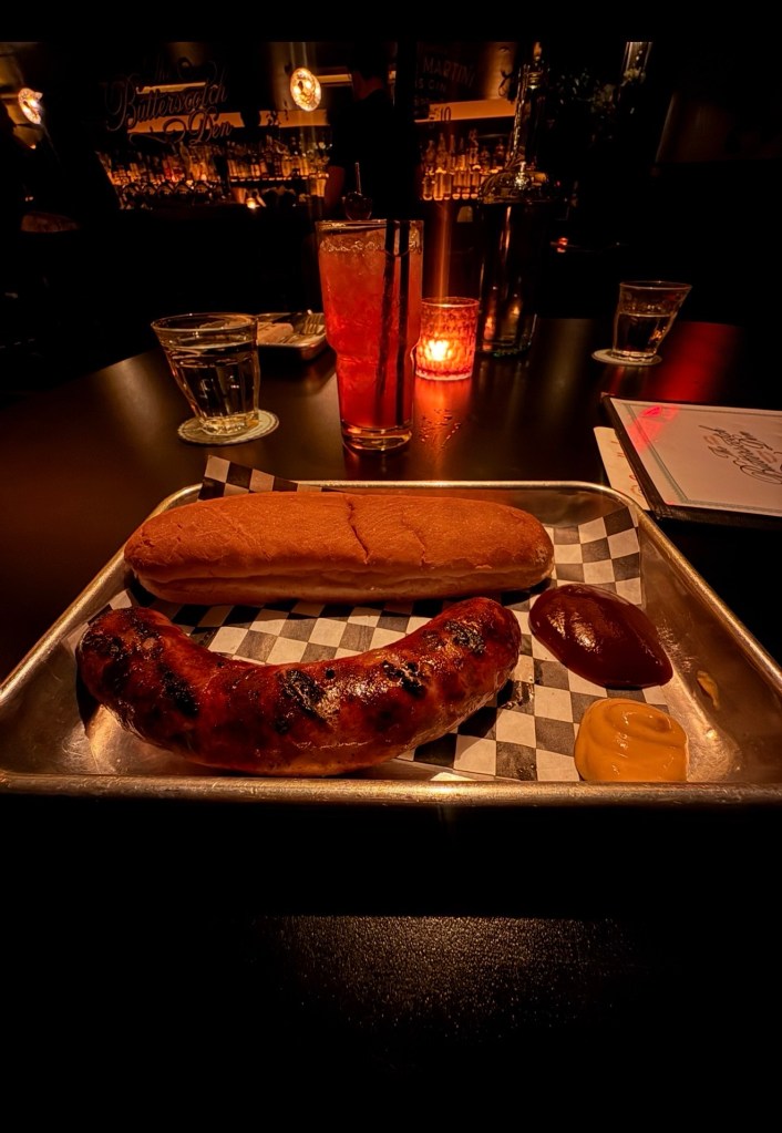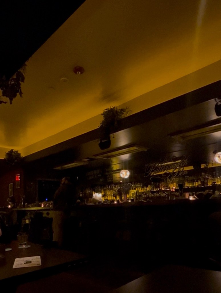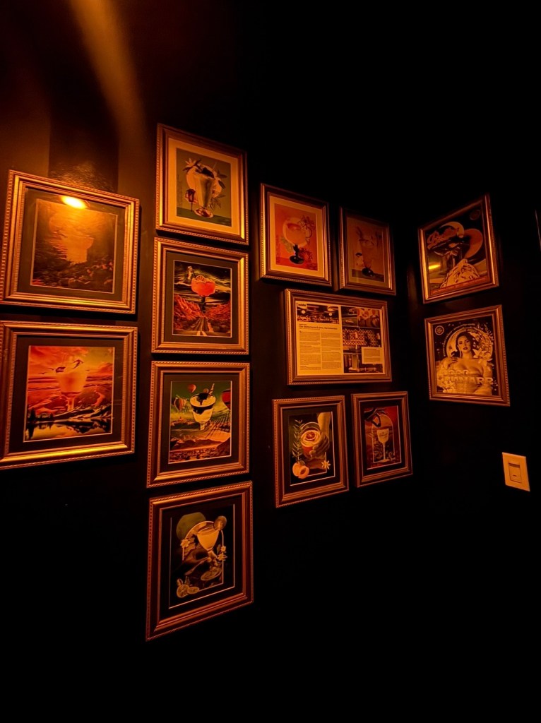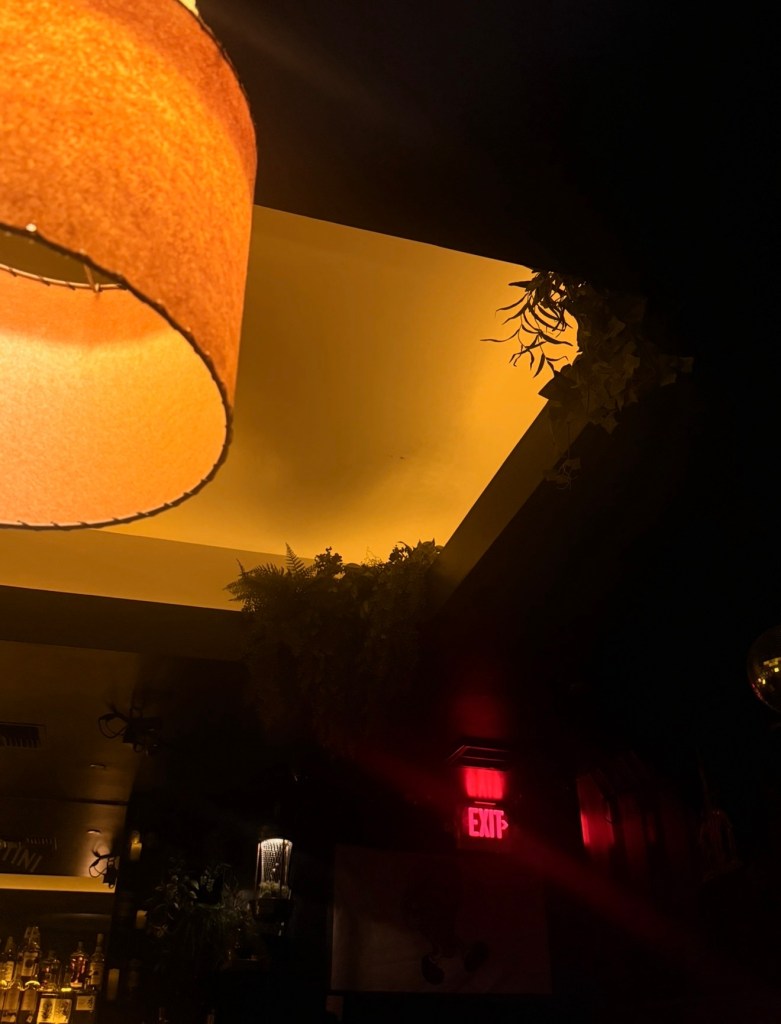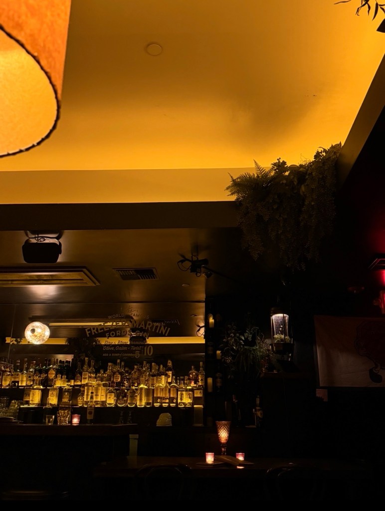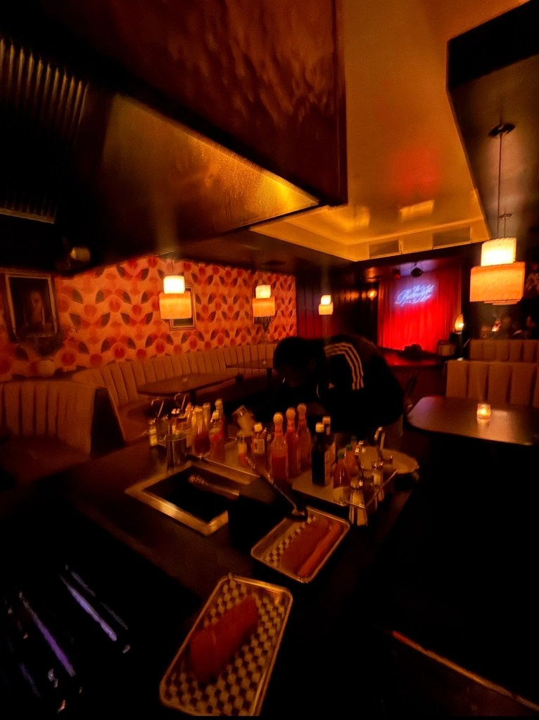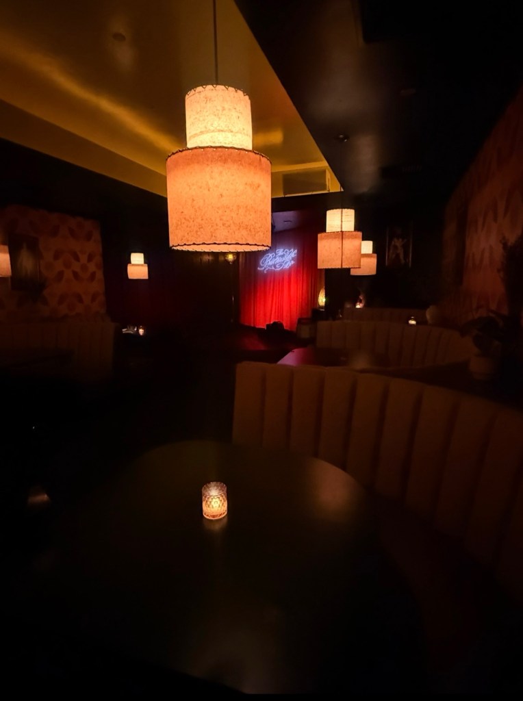 It has this retro 1970s supper club energy that feels warm, stylish, and slightly mysterious all at once. The lighting is low and golden, the booths feel cozy, and the bar looks like something out of an old jazz lounge.